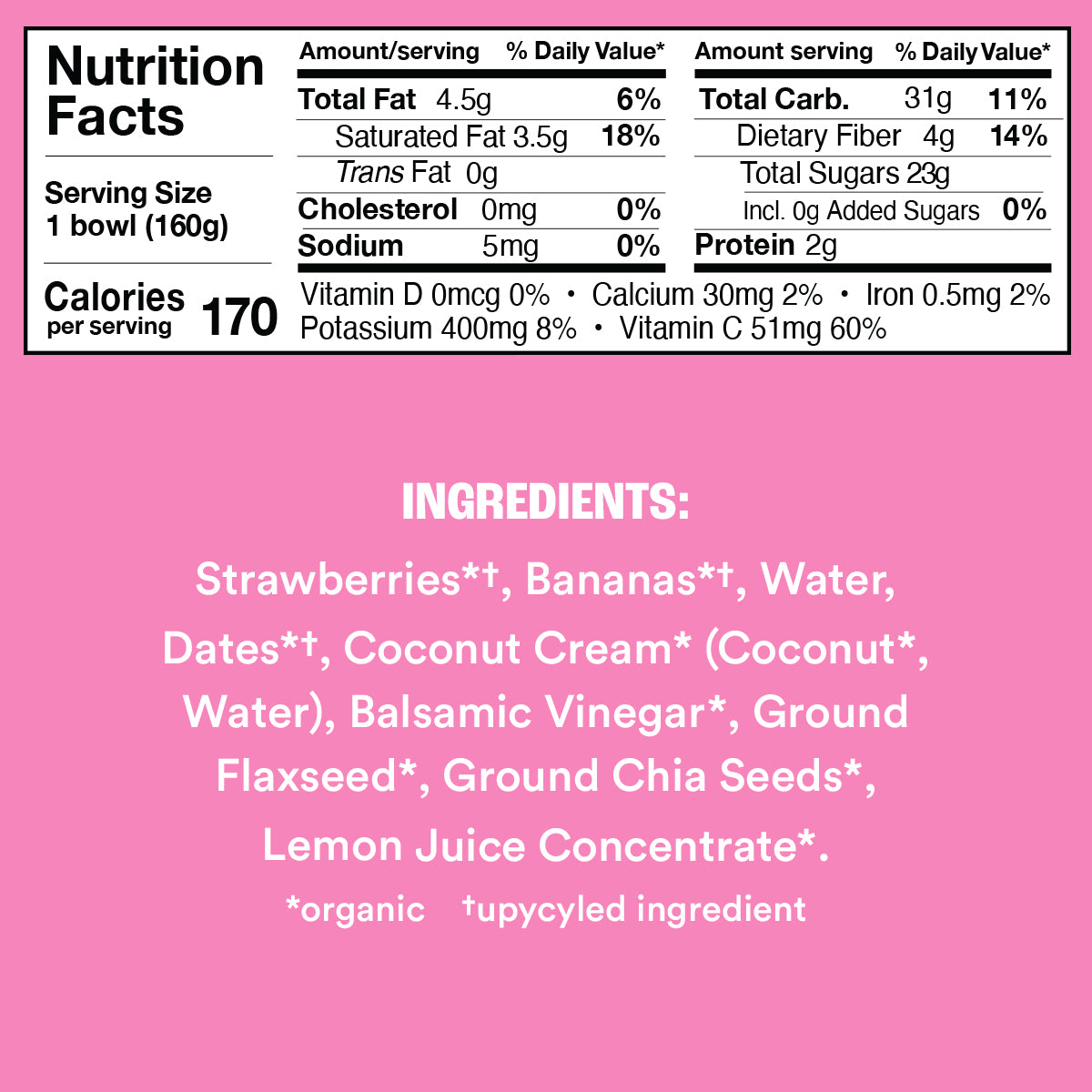 Introducing our Strawberry Smoothie Bowl – Classic, sweet, and endlessly crave-able. Sweet organic strawberries and bananas are elevated with dates, seeds, and a hint of balsamic vinegar that enhances the berry flavor in every spoonful. With an Antioxidant Boost and 60% of your daily Vitamin C, it’s a simple, satisfying choice for breakfast, snack time, or a better-for-you sweet treat. Free from added sugar, dairy, refined sweeteners, and anything artificial—just real, organic ingredients blended to perfection.