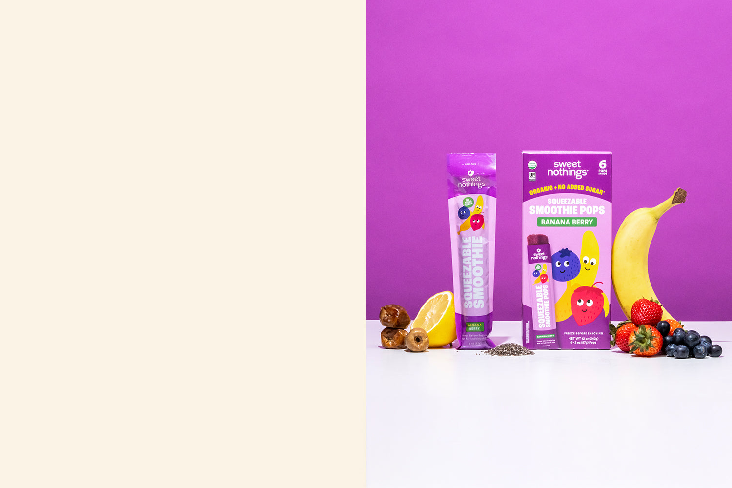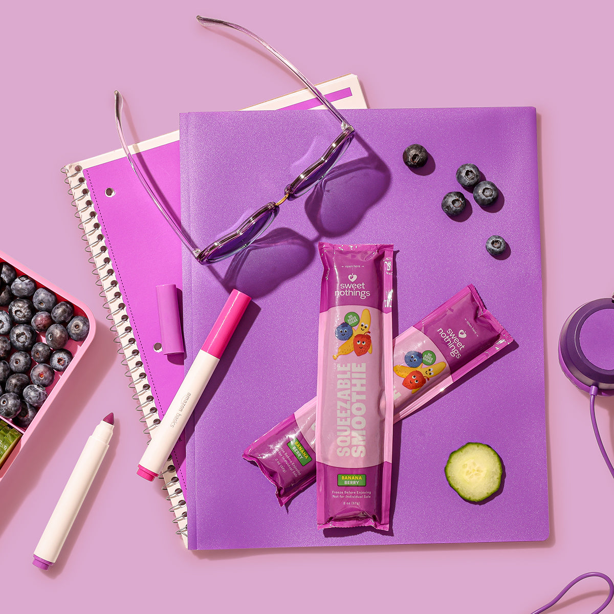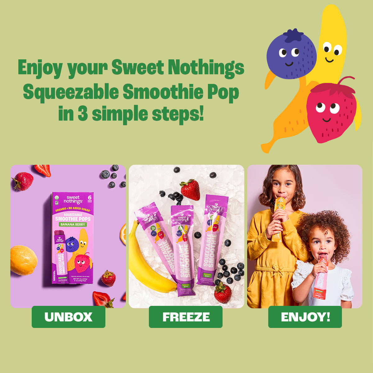 Our Banana Berry Squeezable Smoothie Pops flavor is our newest, wholesome combination of organic ingredients in a delicious pop! These Squeezable Smoothies come in six pre-blended pops of all-natural nutrition with zero added sugar and are made from real, recognizable ingredients.